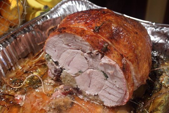 I removed all the bones, applied a generous layer of herbs and spices, and then some buttery, cranberry bread stuffing. I rolled, tied it up, and slowly roasted it until I had the crispy-skinned beauty you see below. It was so good!